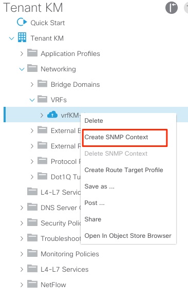 NOTE: To access context specific MIBs, you have to enable the tenant by right clicking on the VRF in the tenant and clicking “Create SNMP Context”. See below figure